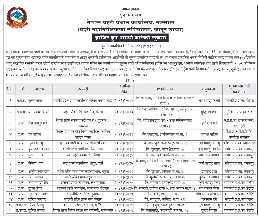 प्रहरी प्रधान कार्यालयको कानुन शाखाले आज सूचना जारी गर्दै १६ जना प्रहरी लामो समयदेखि गैरहाजिर रहेको कारण उनीहरुलाई सम्पर्कमा आउन सात दिनको समय दिएको हो। गैर हाजिर हुनेमा सहायक दुईजना सहायक हबलदार, १२ जना प्रहरी जवान र दुईजना कार्यालय सहयोगी छन्।
