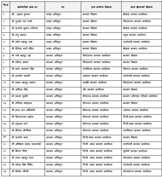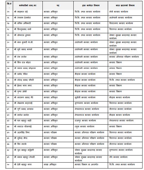 काठमाडौं (केशव भट्टराई)। भन्सार विभागले आफू मातहतका ५३ जना अधिकृतहरुको काज सरुवा गरेको छ । देशका विभिन्न भन्सार कार्यालयहरुमा तत्कालका लागि काज सरुवा गरिएको हो । असोज लागेपछि उनीहरुको काजलाई सरुवामा कन्भर्ट गरिने भएको छ ।